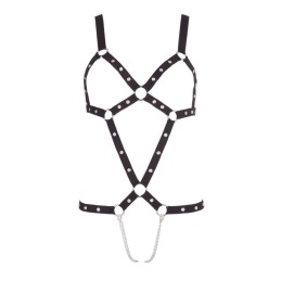 Intense sessioni di bondage. Con questo corpo nero fatto di cinghie web borchiate i giochi di bondage caldi sono pre-programmati! Particolarmente formicolanti sono 2 catene metalliche rimovibili che corrono attraverso il cavallo...