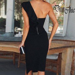 Abito nero lunghezza sotto il ginocchio con spacco laterale, monospalla con volant e chiusura tramite cerniera sulla schiena.