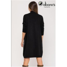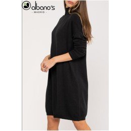 Vestito nero corto sopra il ginocchio con collo alto e maniche lunghe.