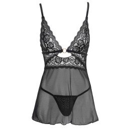 Babydoll corto di Cottelli LINGERIE realizzato in powernet fine elastico con coppe in pizzo tenute insieme da un anello color oro. Fascia sottoseno e cinghie si uniscono sul retro anche con un anello color oro. Cinghie regolabili. Perizoma semplice in powernet incluso.