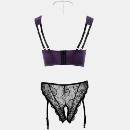 Mutandine longilinee liftate e con reggicalze ouvert di Abierta Fina realizzate in raso elastico viola con fini inserti in pizzo nero e guarnite con catene di strass color oro rosa. Il ferretto con coppe leggermente imbottite porta il seno in forma alta e direttamente nel campo visivo. Le catene e la collana sono staccabili dal bustier. Le cinghie larghe corrono nella parte posteriore come cinghie a 4 pieghe e sono regolabili. Le mutandine con bretelle sono fatte di un mix di materiali nella parte anteriore e completamente di pizzo nella parte posteriore. Tre stimolanti catene al cavallo conducono attraverso l'invitante cavallo aperto, che sono anche rimovibili, così come le bretelle regolabili.