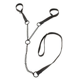 Le manette strette con un guinzaglio sono realizzate in materiale morbido che ha un aspetto in pelle. Le manette, che si adattano perfettamente ai polsi, e il guinzaglio sono uniti da una catena di metallo. Nero. Guinzaglio e manette: ca. 90 cm. Materiale: poliuretano, metallo.