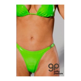 Il lattice lucido su tessuto a maglia elastico lo rende sbalorditivo e morbido sulla pelle. Lo slip tanga ha una chiusura a clip su ciascun fianco, la parte superiore del bikini ha coppe triangolari e lacci.