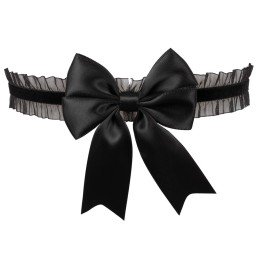 Giarrettiera nera in tulle increspato (alta circa 2,5 cm), con nastro di velluto elastico e grande fiocco di raso davanti. 100% poliestere.