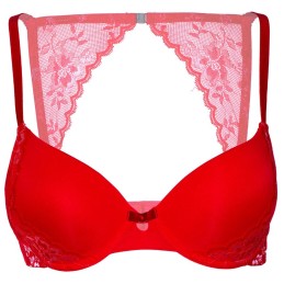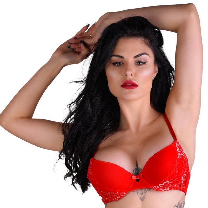 Reggiseno push-up rosso in pizzo. Reggiseno push-up rosso in pizzo, con fiocchetto rosso posto al centro, dettagli floreali sulle coppe e sulla zona posteriore, con ferretto e scollatura sulla schiena.
