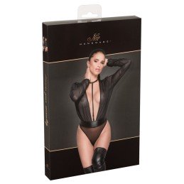 Corpo trasparente a maniche lunghe con camicetta in chiffon e parte superiore in chiffon e mutandina in maglia fine. Scollo extra profondo con ponte regolabile al collo con chiusura a clip. Vita e polsini in Powerwetlook. Mutandine con chiusura a gancio inguinale.